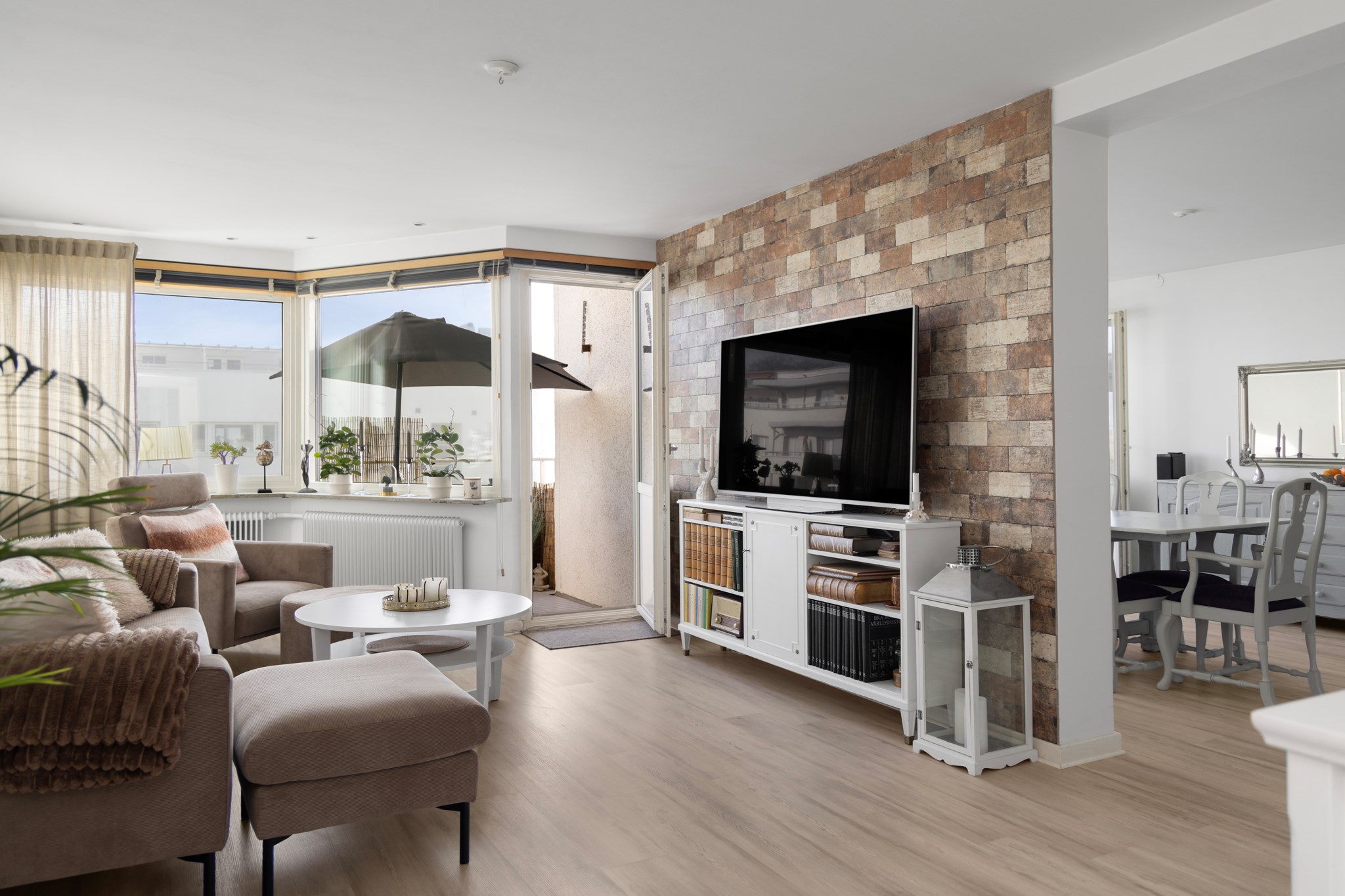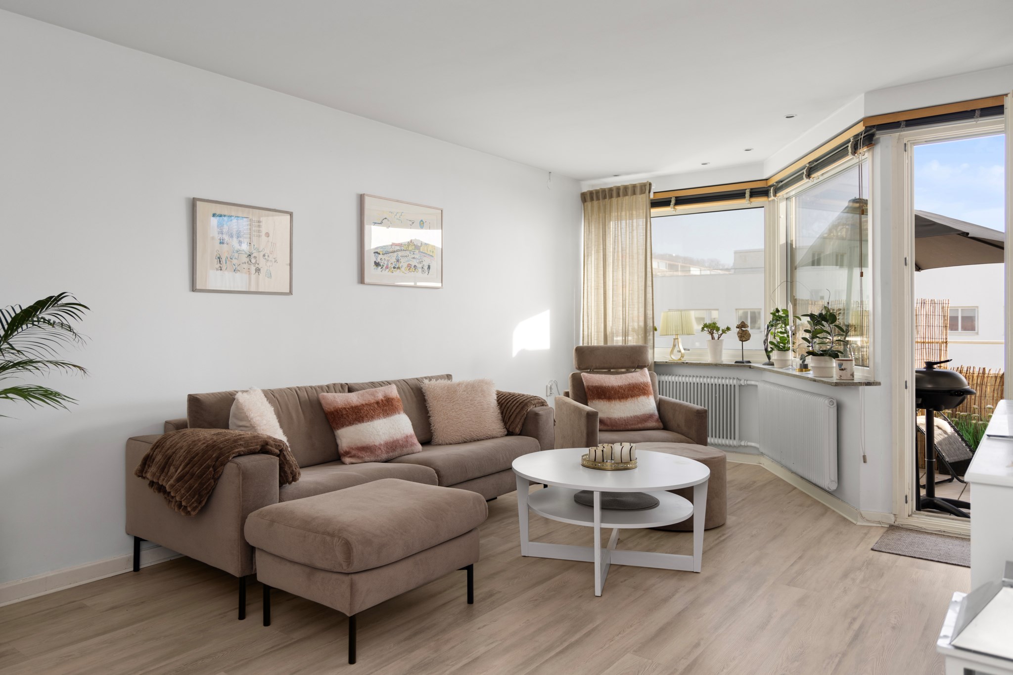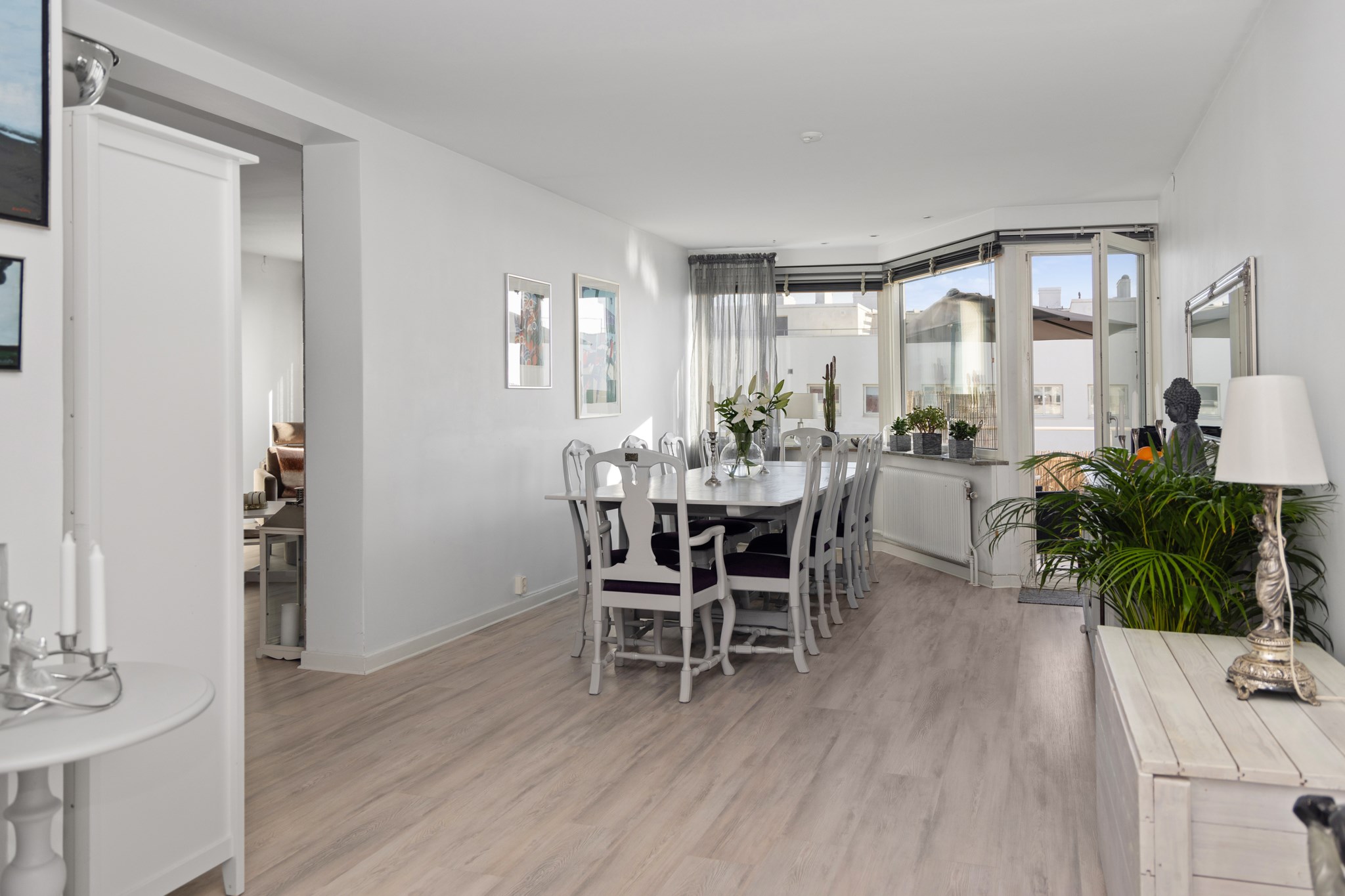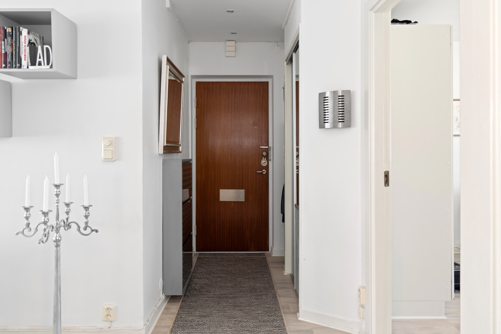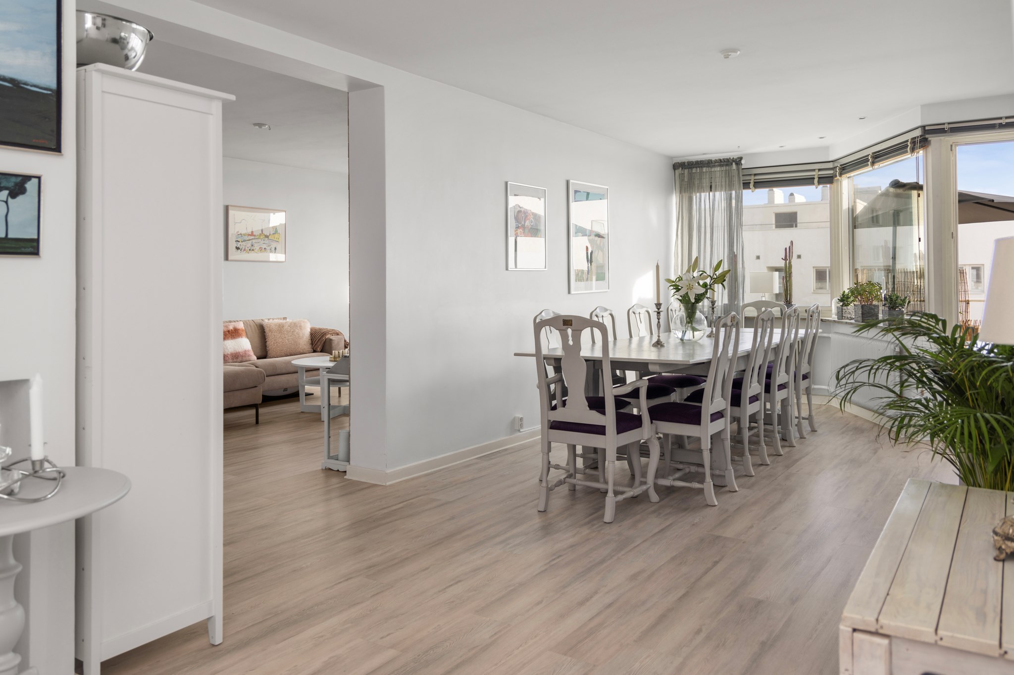 Redan efter ett par steg in i hallen slås man av bostadens härliga ljusinsläpp. Matrum och vardagsrum är belägna till höger och flyter ihop fint med den stora öppningen emellan. Från vardagsrummet finns en passage med garderobsparti och ett av duschrummen innan vi når två av sovrummen. Ett av dessa har idag en öppning mot köket och kan antingen vara en extra matplats för köket eller ett TV-rum. Vill man nyttja det som sovrum sätts öppningen mot köket igen utan några större kostnader.