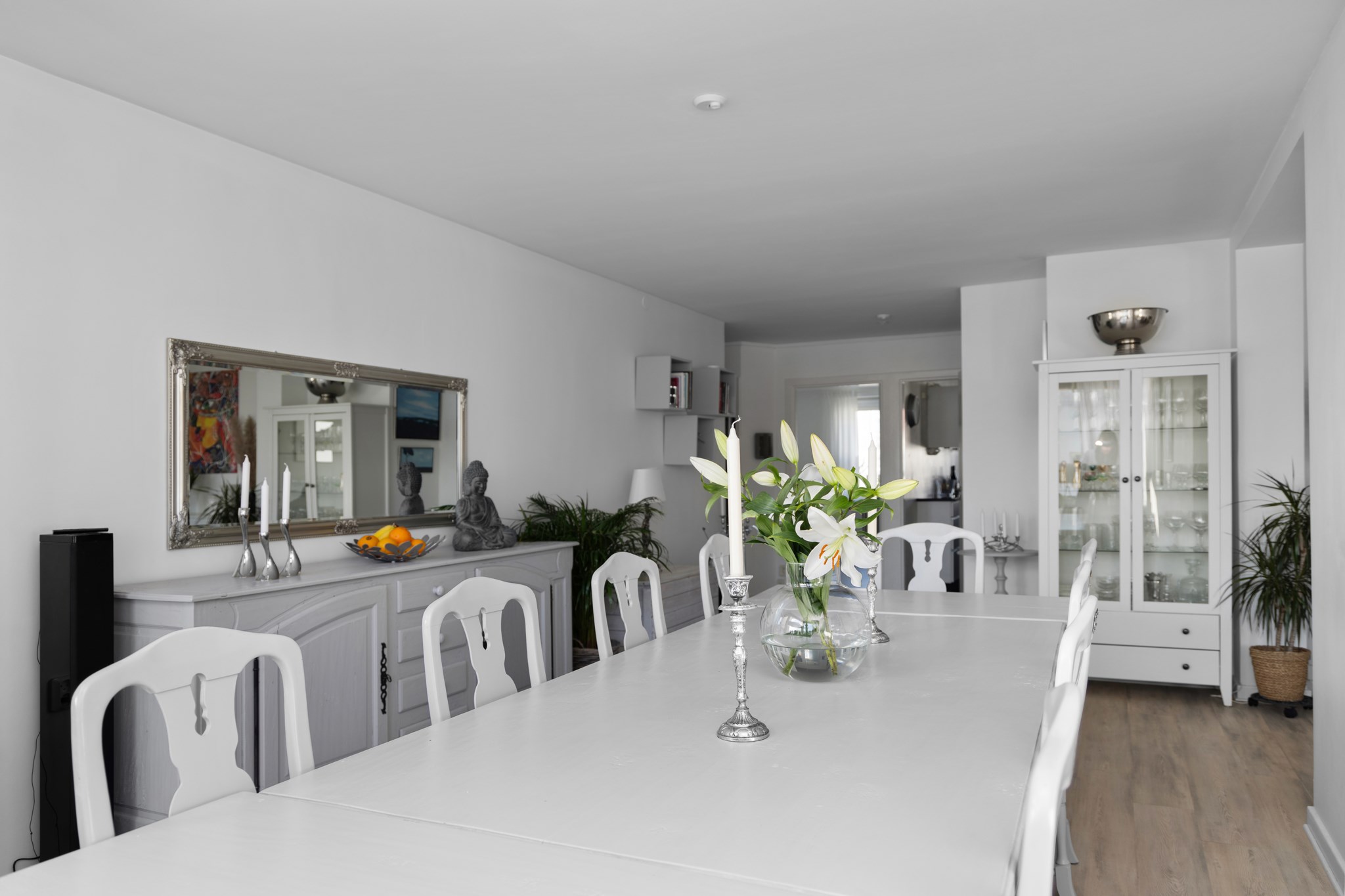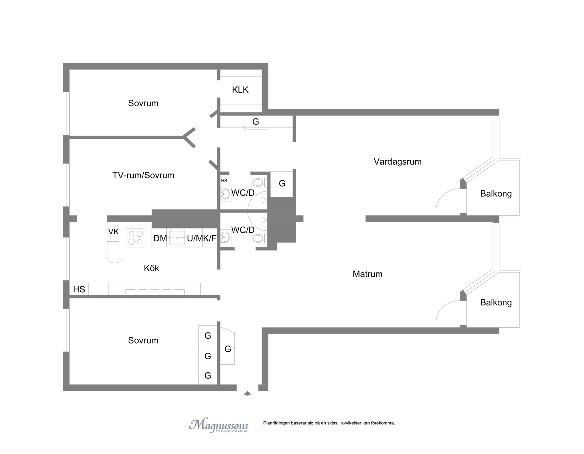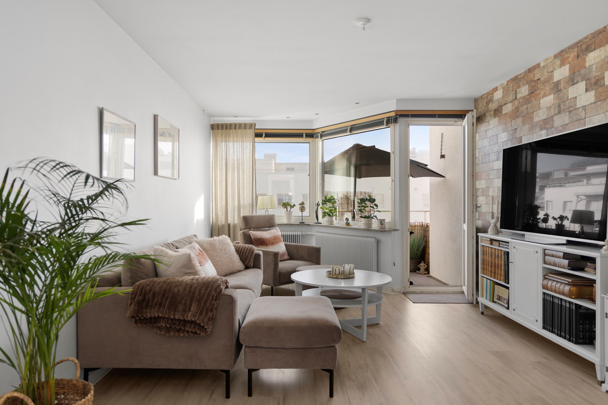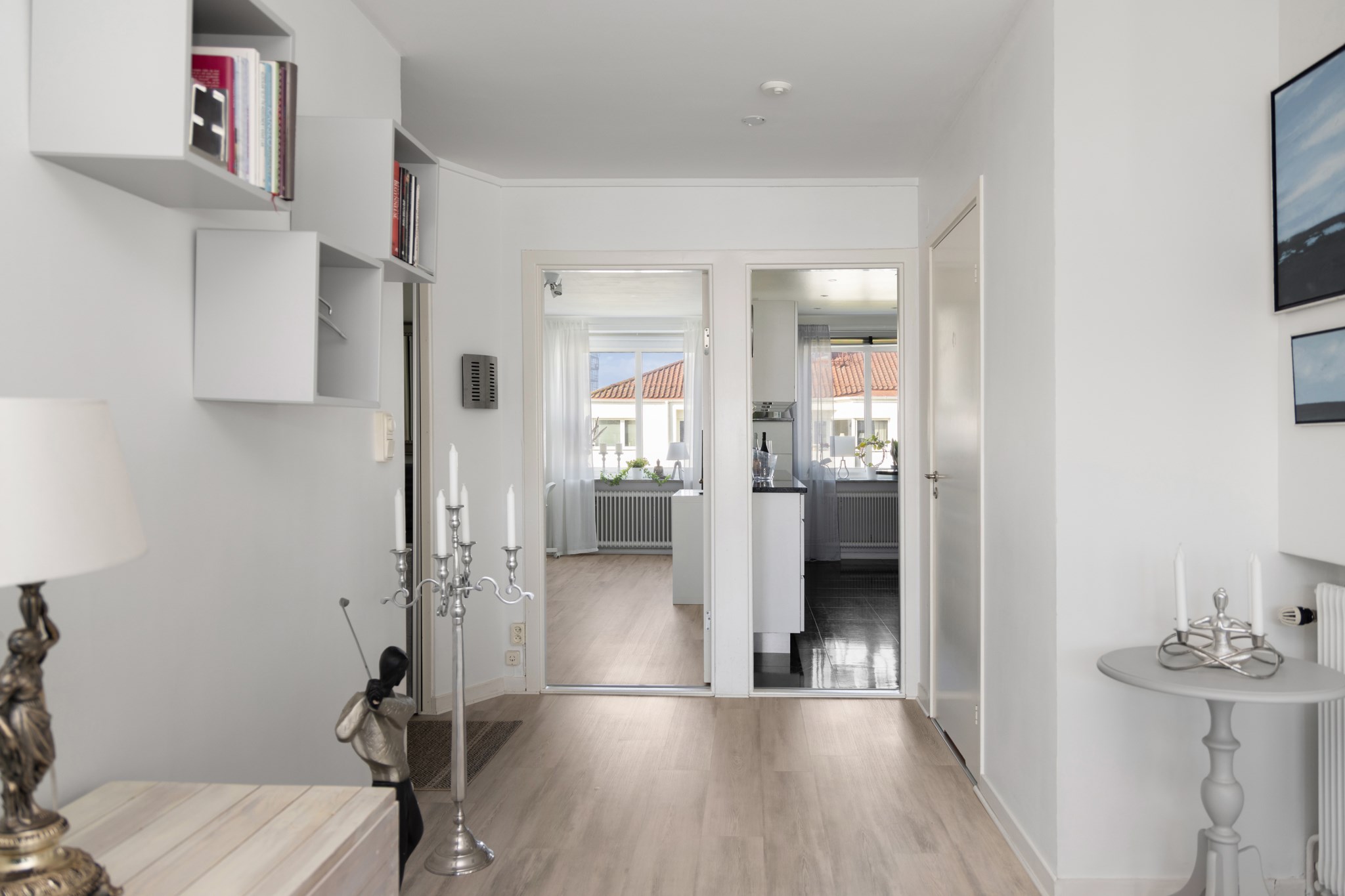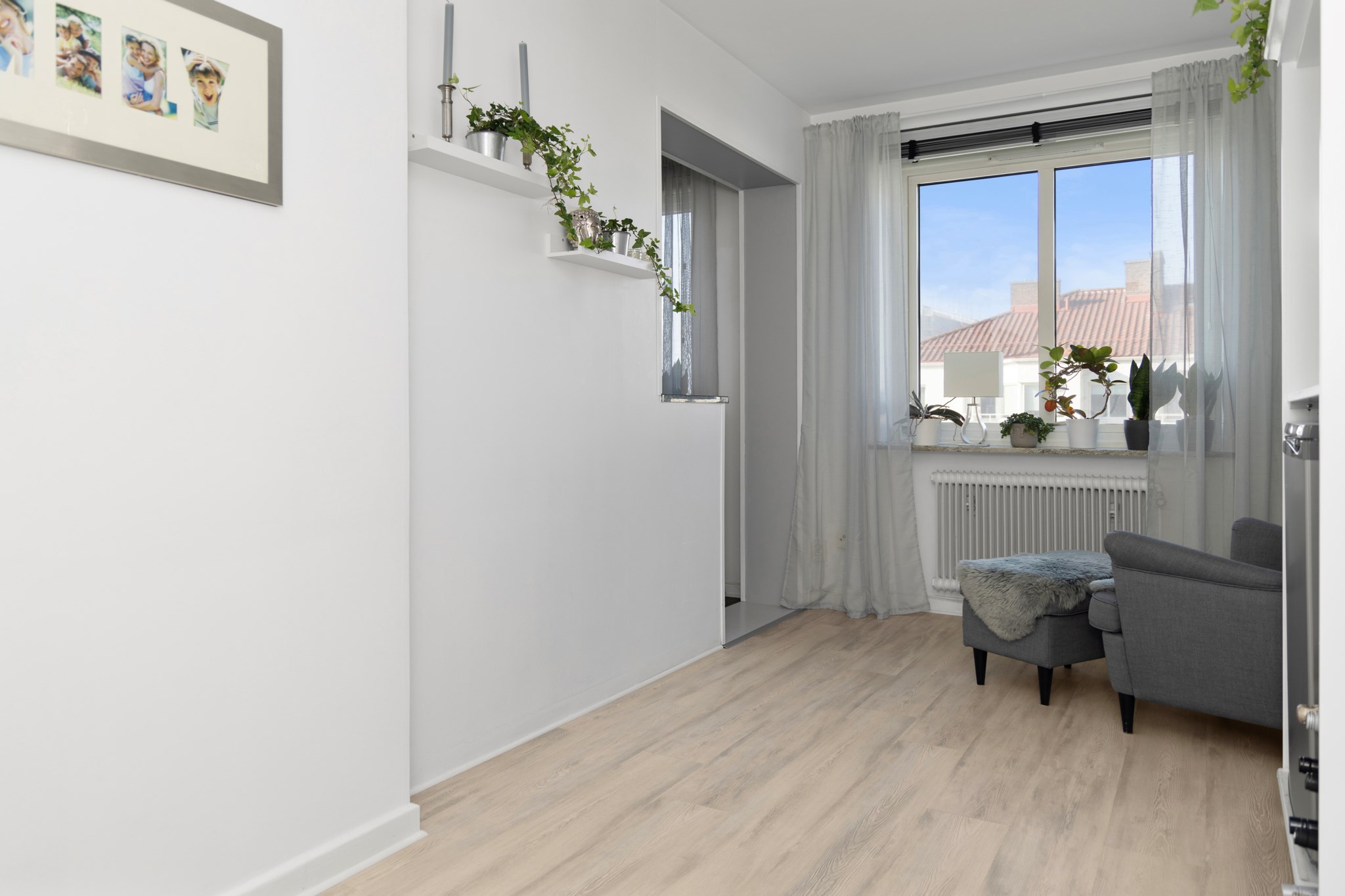 Redan efter ett par steg in i hallen slås man av bostadens härliga ljusinsläpp. Matrum och vardagsrum är belägna till höger och flyter ihop fint med den stora öppningen emellan. Från vardagsrummet finns en passage med garderobsparti och ett av duschrummen innan vi når två av sovrummen. Ett av dessa har idag en öppning mot köket och kan antingen vara en extra matplats för köket eller ett TV-rum. Vill man nyttja det som sovrum sätts öppningen mot köket igen utan några större kostnader.