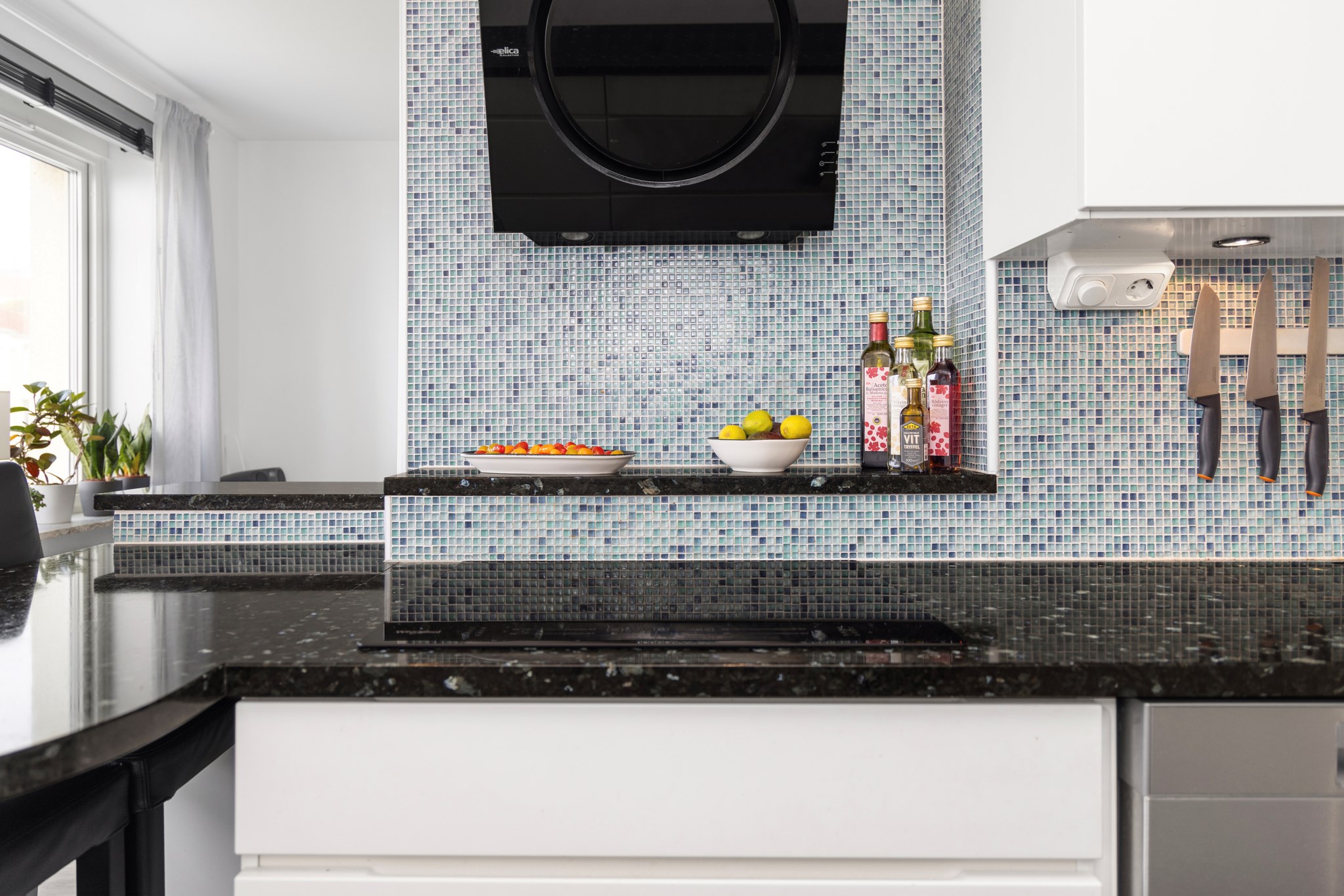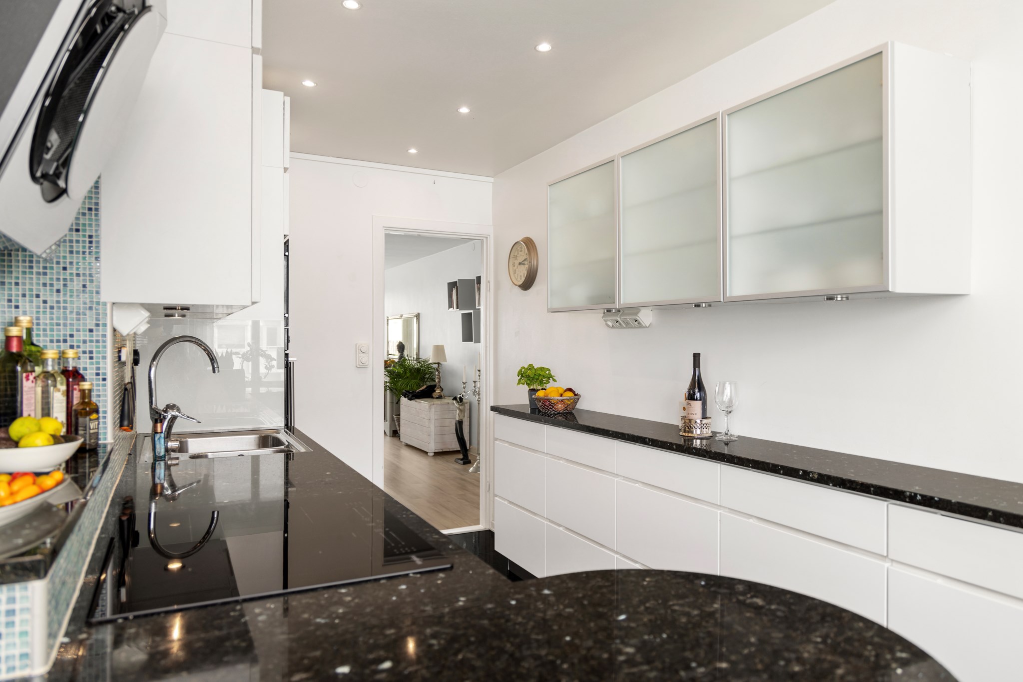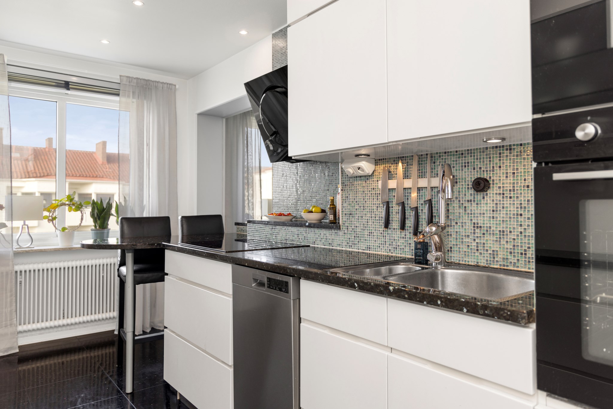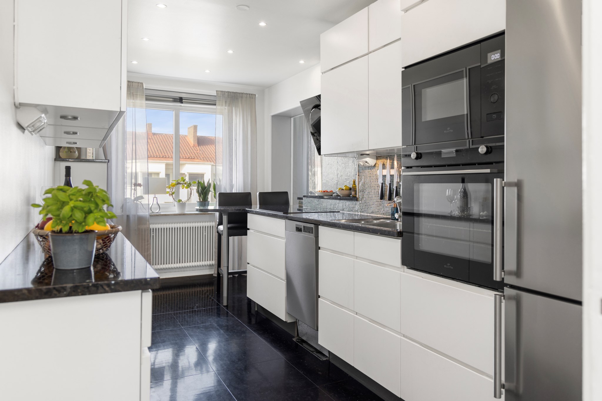 Köket i sig är fräscht och modernt med vita släta luckor och svarta granitskivor. Den maskinella utrustningen består av kyl/frys, induktionshäll, ugn och mikrovågsugn i högskåp, samtliga från 2021, samt en fläkt som är några år äldre.