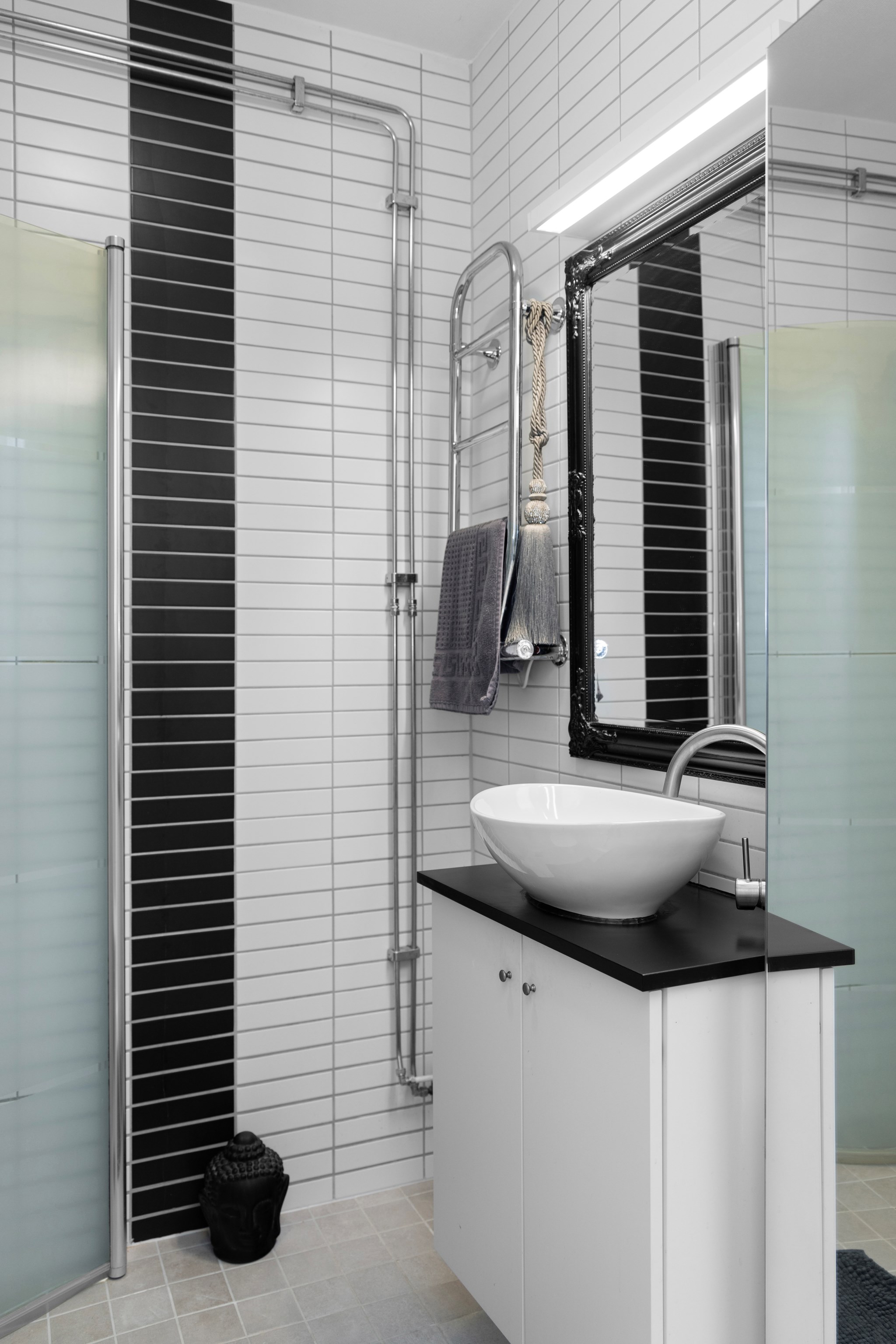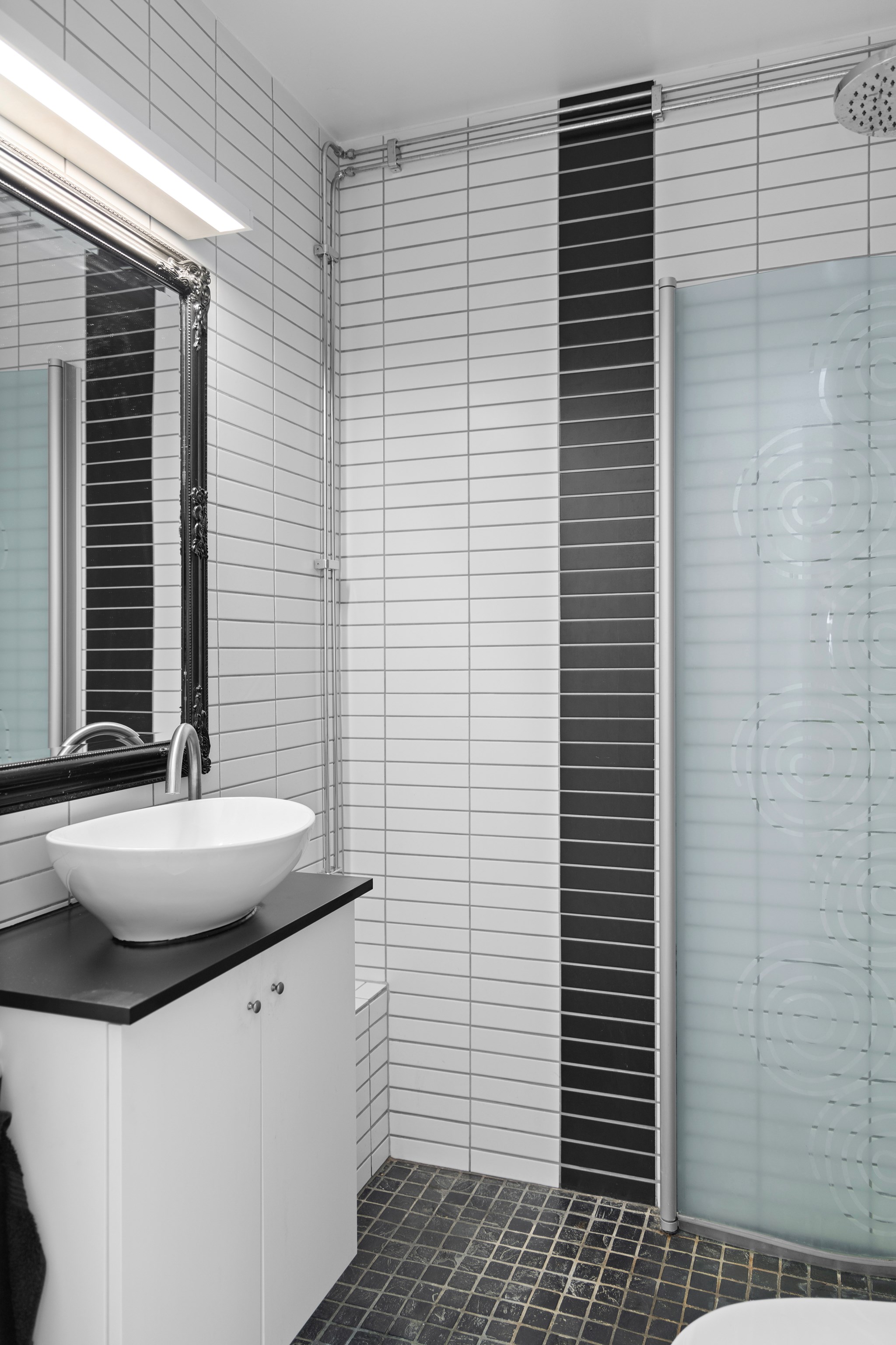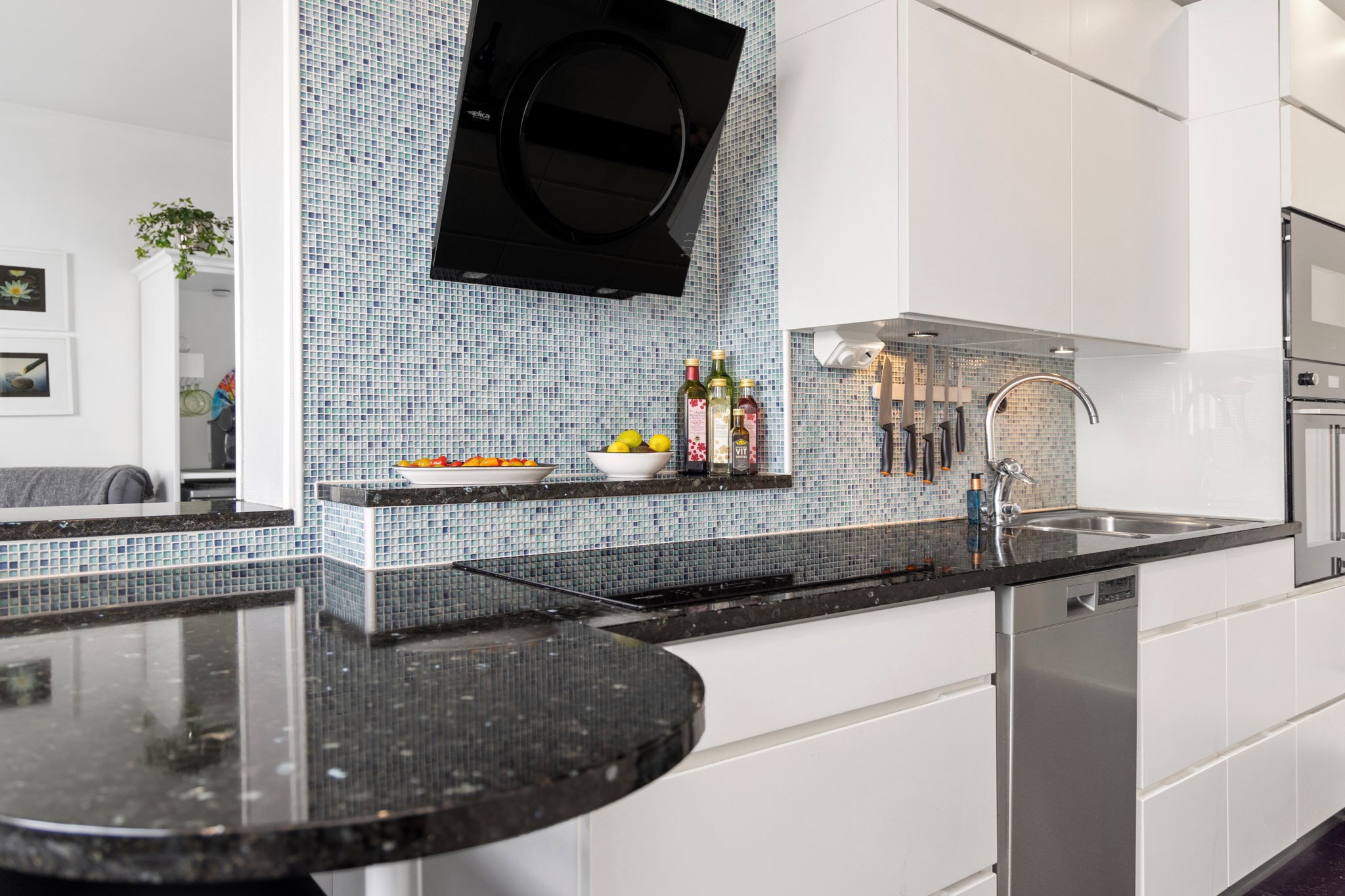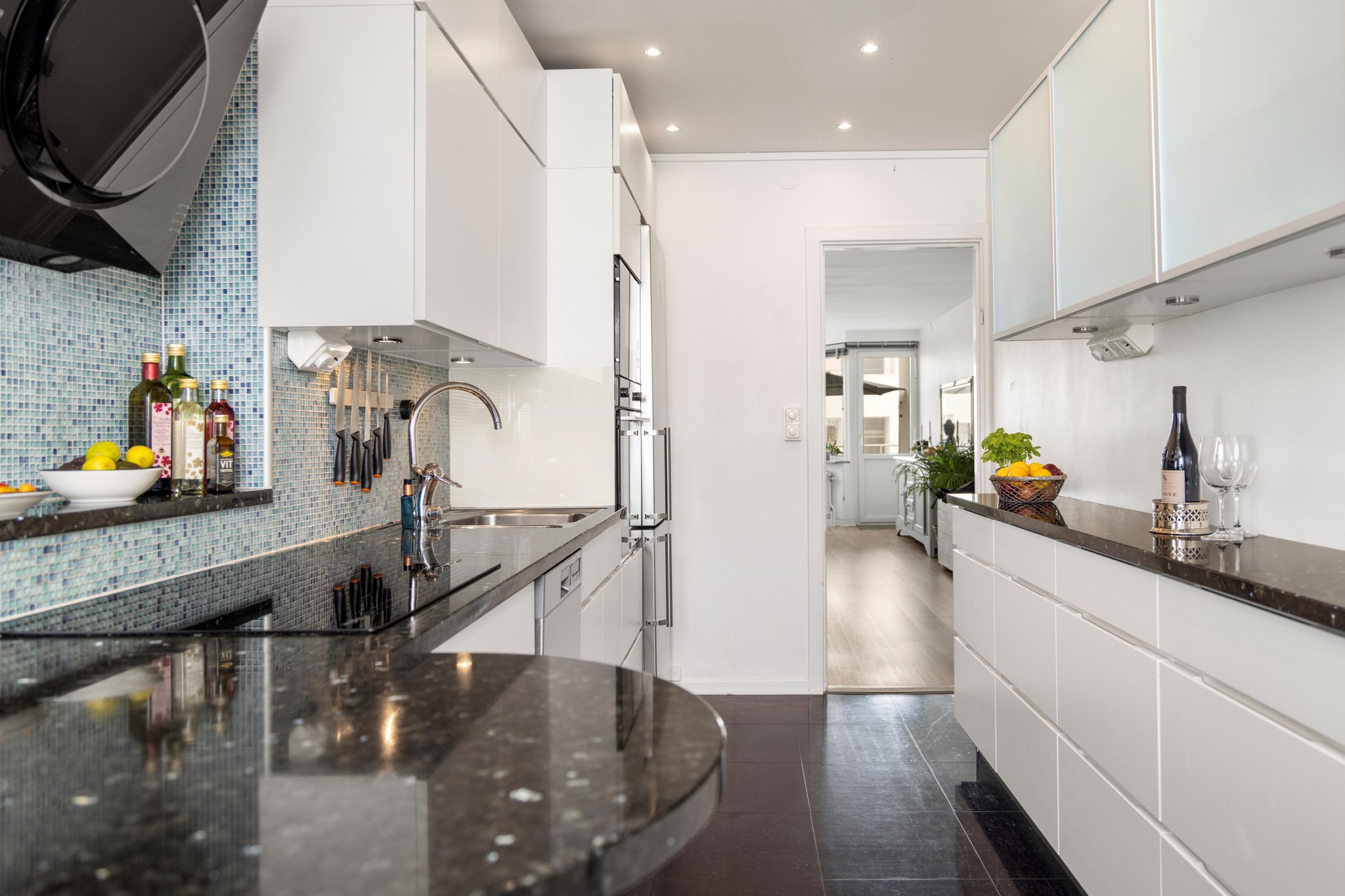 Köket i sig är fräscht och modernt med vita släta luckor och svarta granitskivor. Den maskinella utrustningen består av kyl/frys, induktionshäll, ugn och mikrovågsugn i högskåp, samtliga från 2021, samt en fläkt som är några år äldre.